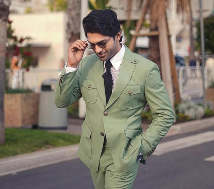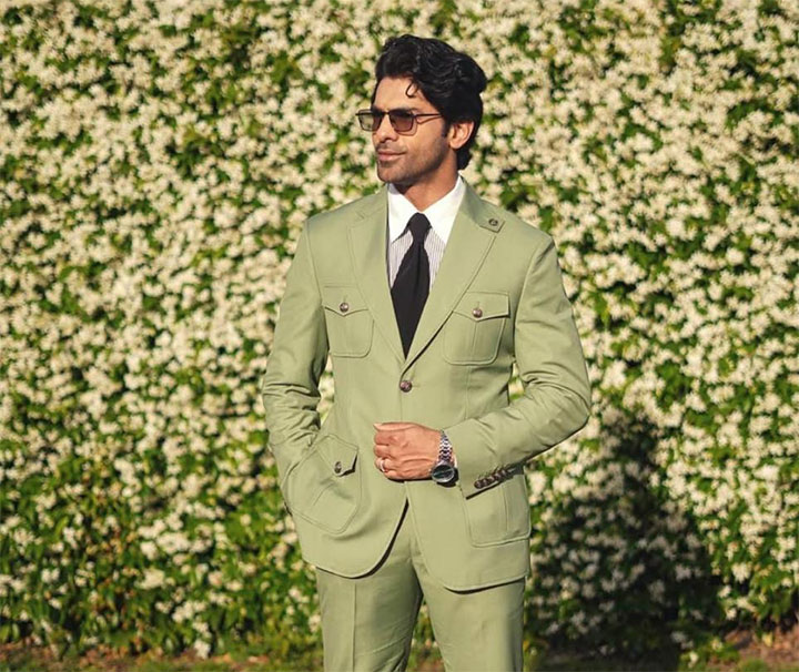 सॉफ्ट ग्रीन सूट कैरी करना आसान नहीं होता, लेकिन ताहा इसे बड़ी सहजता से पहनते हैं। जैकेट पर डबल पॉकेट्स डिफिनिशन जोड़ते हैं, जबकि ब्लैक टाई इस हल्के टोन को बैलेंस करती है। नैचुरल वॉर्म लाइट और सनग्लासेस इस पूरे लुक में एक आसान, कॉन्फिडेंट वाइब देते हैं।
