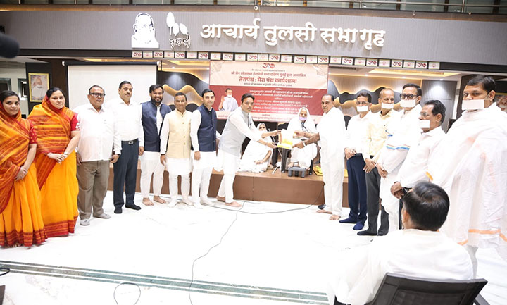 तत्पश्चात सूरत से पधारे हुए मुख्य वक्ता उपासक प्रवक्ता श्री सुरेश जी बाफना का परिचय एवं सम्मान मोमेंटो द्वारा सभी संस्थाओं के पदाधिकारियों द्वारा किया गया । श्री सुरेश जी बाफना ने तेरापंथ के उद्भव से लेकर साध्य और साधन की मीमांसा आदि विषयों का तलस्पर्शी ज्ञान श्रावकों के सामने प्रस्तुत किया । आचार्य भिक्षु की धर्म अधर्म की कसौटी, व्यावहारिक कर्तव्य – आध्यात्मिक धर्म की विवेचना की। उपस्थित श्रावकों की अनेक जिज्ञासाओं का समाधान भी सुंदर तरीके एवं दृष्टांतो से किया । साध्वी श्री शिवमाला जी ने अपने कुछ विचार रखे। कार्यक्रम का कुशल संचालन सभा मंत्री श्री दिनेश धाकड़ ने किया।