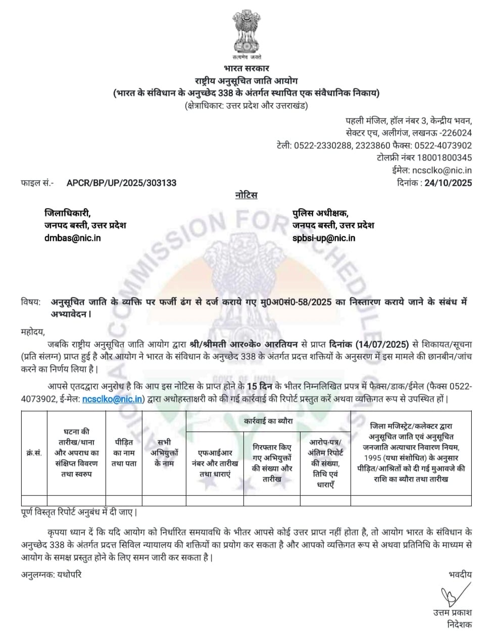 राजकुमार गौतम/बस्ती (यूपी)। राष्ट्रीय अनुसूचित जाति आयोग (एनसीएससी) ने बस्ती जिले में दलित कार्यकर्ता और भारत मुक्ति मोर्चा के जिलाध्यक्ष आर.के. आरतियन के खिलाफ कथित तौर पर फर्जी मुकदमा दर्ज कराने के गंभीर आरोपों पर संज्ञान लिया है। आयोग ने जिलाधिकारी और पुलिस अधीक्षक बस्ती को नोटिस जारी कर 15 दिनों के अंदर विस्तृत कार्रवाई रिपोर्ट मांगी है। मामले में पुलिस क्षेत्राधिकारी सदर सत्येंद्र भूषण त्रिपाठी और थानाध्यक्ष वाल्टरगंज उमाशंकर तिवारी पर साजिश रचकर झूठा मुकदमा दर्ज कराने और उत्पीड़न का आरोप लगा है।