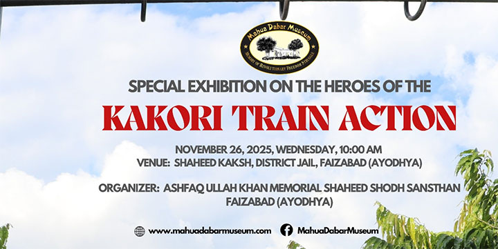 बस्ती/अयोध्या (उ.प्र.)। महुआ डाबर संग्रहालय द्वारा काकोरी ट्रेन एक्शन के महानायकों से संबंधित पत्र, डायरी, टेलीग्राम, स्मृति-चिह्न, समाचार पत्र, पत्रिकाएँ, पुस्तकें, तस्वीरें और मुकदमों की फाइलों सहित महत्वपूर्ण दस्तावेजों की प्रदर्शनी आगामी 26 नवंबर 2025 को जिला कारागार फैजाबाद-अयोध्या के शहीद कक्ष में आयोजित की जाएगी।
