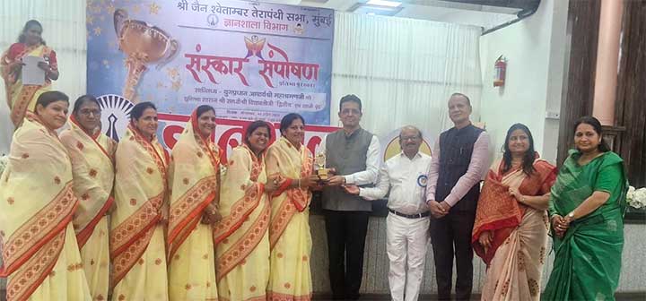 कांदिवली। कांदिवली भवन में संस्कार संपोषण कार्यक्रम का आयोजन मंगलवार 14 अप्रैल 2026, मंगलवार किया गया। इस मौके पर संतोषनगर ज्ञानशाला को उभरती ज्ञानशाला का सम्मान मिला तथानीलम जी कोठारी को श्रेष्ठ वरिष्ठ प्रशिक्षक का सम्मान प्राप्त हुआ । मीना जी घीग को साइनिंग स्टार प्रशिक्षक का सम्मान प्राप्त हुआ। ज्ञानशाला संयोजक श्रीमान सोहनराज जी चोपड़ा के सानिध्य में आंचलिक संयोजिका श्रीमती राजश्री जी कच्छारा मानकजी धींग श्रीमान दिनेशजी सुतरिया आदि गणमान्य पदाधिकारियों की उपस्थिति में संतोष नगर {गोरेगांव} ज्ञानशाला को सम्मानित किया गया। यह जानकारी मुख्य प्रशिक्षक श्रीमती कल्पना जी चौरडिया द्वारा दी गई।