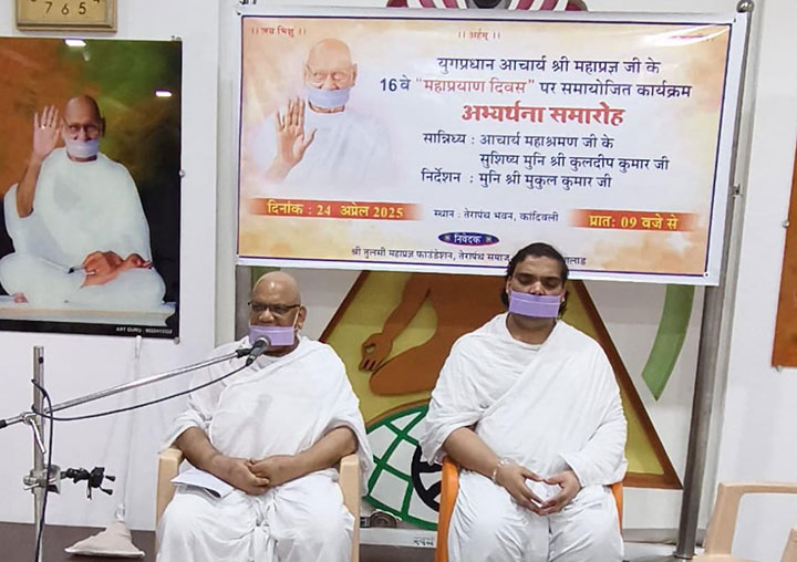विकास धाकड़/मुंबई। युगप्रधान आचार्य श्री महाश्रमण जी के सुशिष्य मुनि श्री कुलदीप कुमार जी एवं मुनि श्री मुकुल कुमार जी के सानिध्य में आचार्य महाप्रज्ञ का 16वां महाप्रयाण दिवस अभ्यर्थना समारोह के रूप में समायोजित हुआ। इस अवसर पर मुनि श्री कुलदीप कुमार जी ने कहा- नत्थू से आचार्य महाप्रज्ञ की यात्रा विकास की ऊर्जस्वल यात्रा है। उनकी प्रज्ञा ने नए आयाम प्रस्तुत किए हैं। युगीन समस्याओ को बारीकी से प्रस्तुत कर समाधान की दिशा दिखाई। उनका साहित्य महासूर्य की तरह है जिसकी एक किरण भी यदि किसी को प्राप्त हो जाए तो वह जीवन का कल्याण कर सकता है।