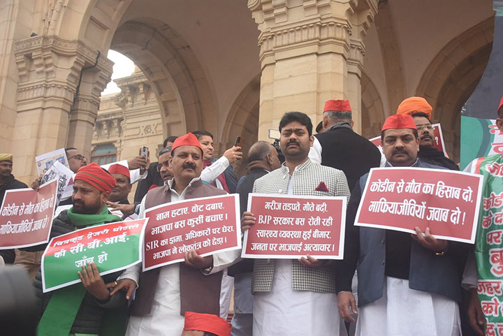कफ सीरप को लेकर समाजवादी पार्टी का यूपी विधानसभा परिसर में प्रदर्शन