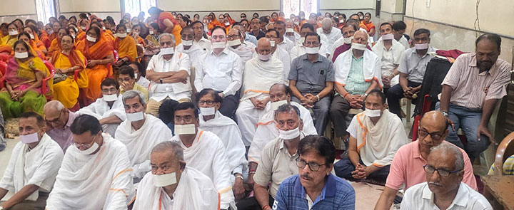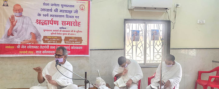 मध्य उत्तर कोलकाता। प्रेक्षाप्रणेता, युगप्रधान आचार्य श्री महाप्रज्ञजी के 16 वें महाप्रयाण दिवस पर श्रद्धार्पण समारोह का आयोजन युगप्रधान आचार्य श्री महाश्रमण जी के सुशिष्य मुनिश्री जिनेश कुमारजी ठाणा -3 के सानिध्य में श्री जैन श्वेताम्बर तेरापंथी सभा मध्य-उत्तर कोलकाता द्वारा हरियाणा भवन में आयोजित हुआ।