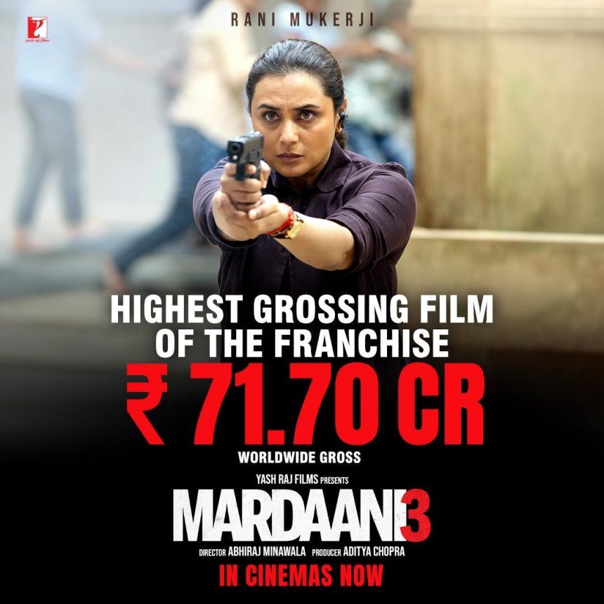 भारत में कुल 47.55 करोड़ रुपये नेट और वर्ल्डवाइड बॉक्स ऑफिस पर 71.70 करोड़ रुपये ग्रॉस की कमाई के साथ, मर्दानी 3 एक ज़बरदस्त हिट बन चुकी है और अब मर्दानी फ्रैंचाइज़ी की सबसे ज़्यादा कमाई करने वाली फिल्म बन गई है।