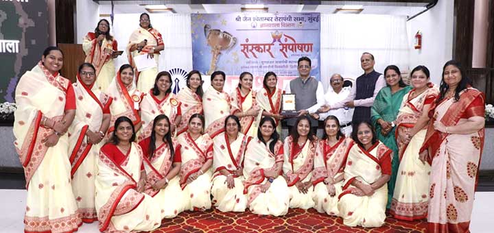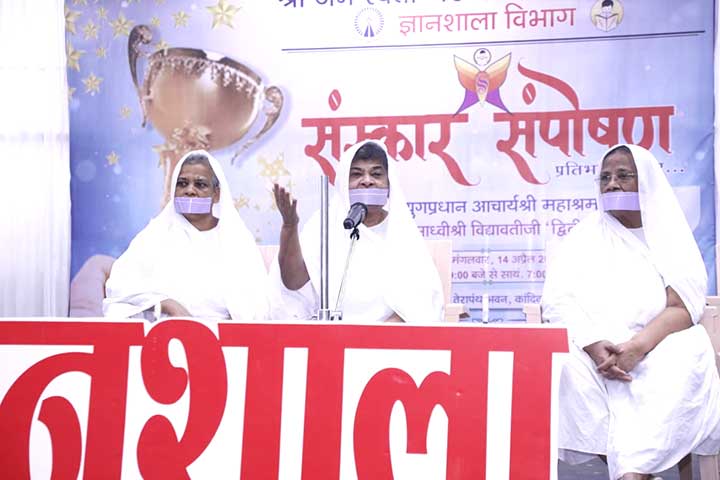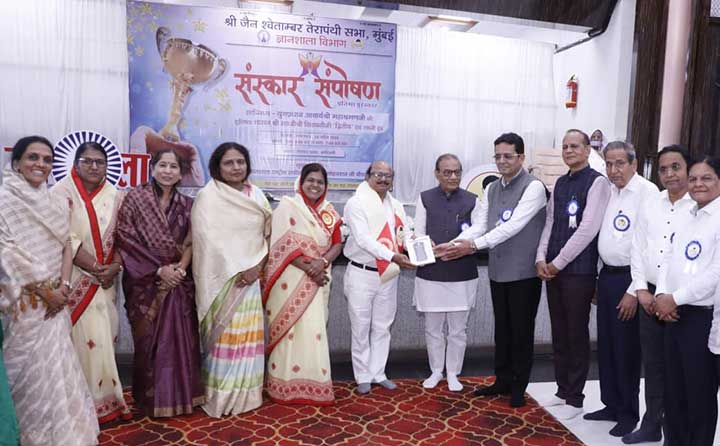 मुंबई। श्री जैन श्वेतांबर तेरापंथी सभा मुंबई ज्ञानशाला द्वारा संस्कार सम्पोषण प्रतिभा पुरस्कार समारोह का आयोजन कांदिवली के राजभवन तेरापंथ भवन में आचार्य श्री महाश्रमण जी की विदुषी शिष्या शासनश्री साध्वी श्री विद्यावतीजी’द्वितीय’ के सानिध्य में समायोजित हुआ। सम्मान समारोह के प्रथम चरण में साध्वीवृन्द ने नमस्कार महामंत्र का पाठ सुनाया उसी के साथ ज्ञानशाला गीत के सामूहिक संगान करते हुए कार्यक्रम का भव्य आगाज हुआ । जीतमाल जोन की बहनों ने सुमधुर मंगलाचरण की प्रस्तुति दी।