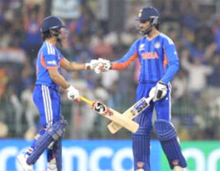 आज यहां इससे पहले भारत ने पाकिस्तान के खिलाफ टी-20 विश्वकप के इतिहास का सबसे बड़ा स्कोर सात विकेट पर 175 रन खड़ा किया। पाकिस्तान ने टॉस जीतकर पहले गेंदबाजी करने का फैसला किया। बल्लेबाजी करने उतरी भारत की शुरुआत खराब रही और उसने अभिषेक शर्मा (शून्य) का विकेट गंवा दिया। इसके बाद बल्लेबाजी करने आये तिलक वर्मा ने इशान किशन के साथ दूसरे विकेट के लिए 87 रन जोड़े। नौवें ओवर में सैम अयूब ने विस्फोटक बल्लेबाजी कर रहे इशान किशान को बोल्ड कर इस साझेदारी का अंत किया। इशान किशान ने 40 गेंदों में 10 चौके और तीन छक्के उड़ाते हुए 77 रनों की पारी खेली। 15वें ओवर में सैम अयूब ने तिलक वर्मा 24 गेंदों में 25 रन और उसके अगली ही गेंद पर हार्दिक पंड्या (शून्य) को आउट कर पाकिस्तान की मैच में वापसी कराई। 19वें ओवर में उस्मान तारिक की गेंद पर बड़ा शॉट खेलते हुए सूर्यकुमार यादव बाउंड्री पर कैच आउट हुये। सूर्यकुमार यादव ने 29 गेंदों में तीन चौकों की मदद से 32 रन बनाये। शिवम दुबे ने 17 गेंदों में तीन चौके और एक छक्के की मदद से 27 रन बनाये। भारत ने निर्धारित 20 ओवरों में सात विकेट पर 175 रनों का चुनौतीपूर्ण स्कोर खड़ा किया। रिंकू सिंह चार गेंदों में 11 रन बनाकर नाबाद रहे। पाकिस्तान के लिये सैम अयूब ने तीन विकेट लिये। शाहीन शाह अफरीदी और आगा सलमान ने एक-एक बल्लेबाज को आउट किया।