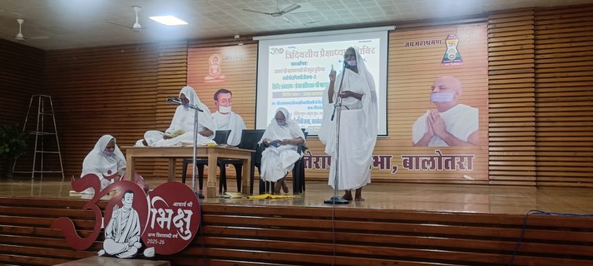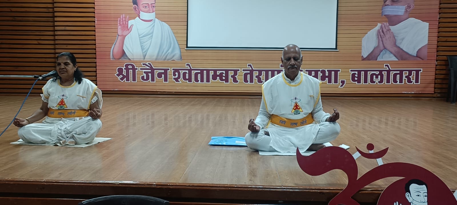 बालोतरा। प्रेक्षा फाउंडेशन के तत्वावधान में तेरापंथ सभा व प्रेक्षावाहिनी बालोतरा द्वारा प्रबुद्ध साध्वी श्री अणिमा श्री जी ठाणा 5 के सान्निध्य में त्रिदिवसीय आवासीय प्रेक्षाध्यान कार्यशाला का आयोजन 8-9-10 अक्टूबर को न्यू -तेरापंथ भवन बालोतरा में किया गया। प्रेक्षावाहिनी – प्रशिक्षक ममता गोलेच्छा ने बताया कि प्रेक्षा पुरस्कार से सम्मानित वरिष्ठ प्रशिक्षक श्रीमान पारसमल जी दुगड़ व विमला जी दुगड़ के निर्देशन में 8 अक्टूबर को सुबह कार्यशाला का शुभारम्भ हुआ। सर्वप्रथम मंगलाचरण प्रेक्षा-गीत प्रेक्षा-वाहिनी के सदस्यों के द्वारा किया गया।