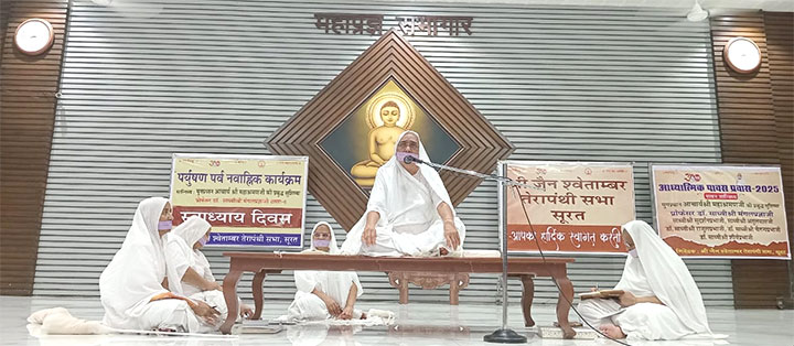 परिषद को प्रेरणा प्रदान करते हुए कहा- सम्यक्त्व पुष्ट बने ऐसा प्रयास हो । तेरापंथ के सिद्धान्त सुरक्षित रहने चाहिए-प्रवाह पातिता त्याज्य है। इस अवसर पर जसोल समदड़ी टापरा, पारलू, बायतू – बाडमेर, मारवाड़ गढ़सीवाना, निवासी सूरत प्रवासी श्रावक-श्राविकाओं द्वारा मंगलाचरण प्रस्तुत किया गया। साध्वी सुदर्शन प्रभा जी ने पर्युषण को अभिनय सामायिक को रंग विषय का प्रतिपादन किया। साध्वी सुदर्शन प्रभाजी, साध्वी अतुलयशा जी, साध्धी डॉ राजूलप्रभाजी,साध्वी डॉ चैतन्य प्रभा जी और साध्वी डॉ शौर्य प्रभा जी ने आठ कर्मों का प्रहार – उज्ज्वल आत्मा का अवतार कार्यक्रम प्रस्तुत किया एवं सामायिक समता की अनुपम साधना गीत का संगान किया। चन्दनबाला के तेले करने वाले साधक साधिकाओं को प्रव्याख्यान करवाया गया । श्री अश्विनी मेहता ने 25 तप का प्रत्याख्यान किया। कार्यक्रम का संचालन साध्वी अतुल यशा जी ने किया। साध्वी डॉ राजुल प्रभा जी ने अभिनव सामायिक का प्रयोग कारवाया।