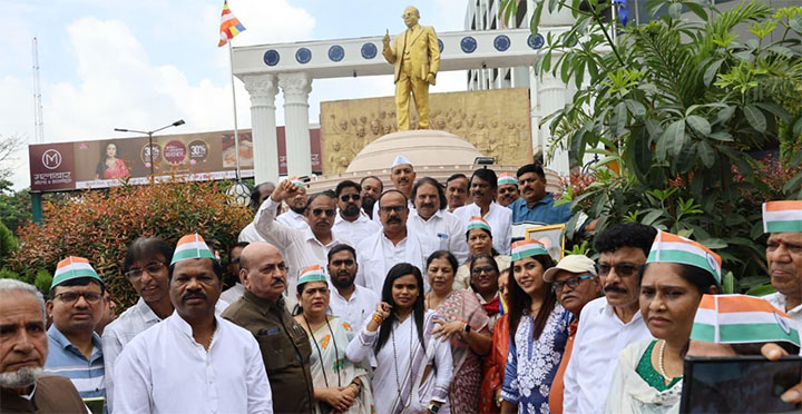 महाराष्ट्र प्रदेश कांग्रेस कमेटी के अध्यक्ष हर्षवर्धन सपकाल के नेतृत्व में आज पनवेल में महामानव भारत रत्न डॉ. बाबासाहेब आंबेडकर की प्रतिमा को नमन कर छत्रपति शिवाजी महाराज स्मारक तक “संविधान संवाद यात्रा” निकाली गई। इसके बाद पनवेल के वासुदेव बलवंत फडके नाट्यगृह में ‘कामगार मेलावा और संविधान जागर 2025’ कार्यक्रम आयोजित किया गया। इस अवसर पर प्रदेश उपाध्यक्ष रामचंद्र आबा दलवी, ओबीसी विभाग के प्रदेशाध्यक्ष भानुदास माली, वरिष्ठ प्रवक्ता गोपाल तिवारी, प्रदेश कार्यकारिणी सदस्य आर. सी. घरत, प्रदेश सचिव श्रुती म्हात्रे, पनवेल शहर जिलाध्यक्ष सुदाम पाटिल, युवक जिलाध्यक्ष हेमराज म्हात्रे, पूर्व नगरसेवक हरेश केणी, पनवेल अर्बन बैंक संचालक जनार्दन पाटिल, शाहीर संभाजी भगत सहित कई पदाधिकारी और कार्यकर्ता उपस्थित थे।