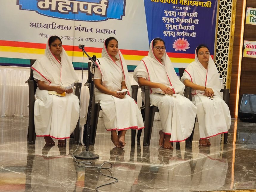 युग प्रधान महातपस्वी आचार्यश्री महाश्रमणजी के आध्यात्मिक निर्देशन में मुमुक्षु श्रेणी से पर्युषण महापर्व के महान अवसर पर धर्म आराधना कराने के लिए मुमुक्षु प्रेक्षाजी ने प्रेक्षा ध्यान करवाया।